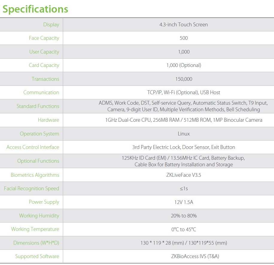EFace10 is a touchless facial identification terminal featuring ZKTeco’s innovative Visible Light Facial Recognition technology With the latest algorithm and Visible Light facial recognition technologies, the device will automatically perform recognition for a target in a long distance when it detects a human face in the detection distance to deliver better recognition quality in terms of speed and accuracy than the previous near-infrared facial recognition terminals. Features:- Visible Light facial recognition