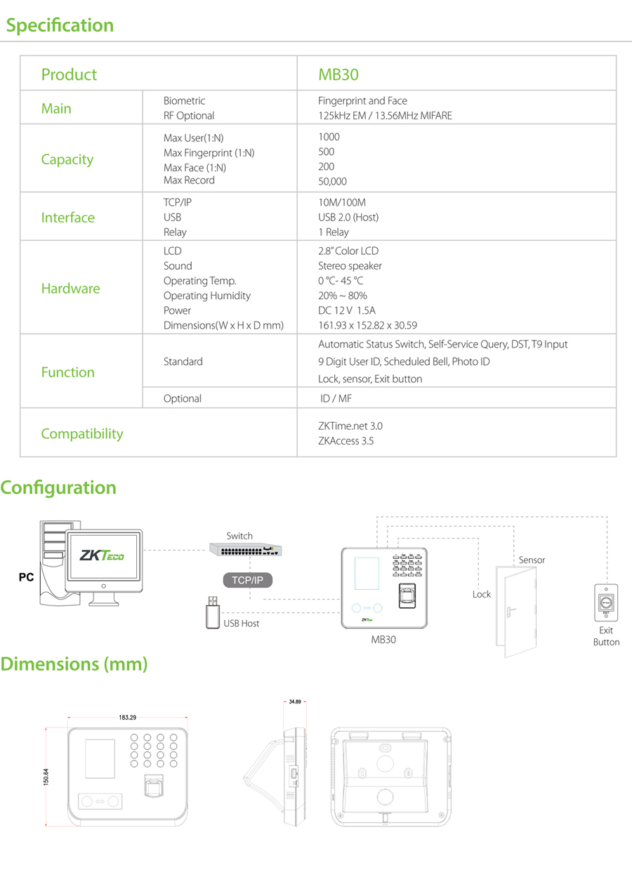 It is equipped with the latest ZK fingerprint and faces recognition algorithms which boots the validation process in less than 1 second and enables rapid access to the users. The transmission of information between MB30 and PC is via TCP / IP and USB interface for manual data transfer. Its unique design and robust attributes make it suitable for any work location.