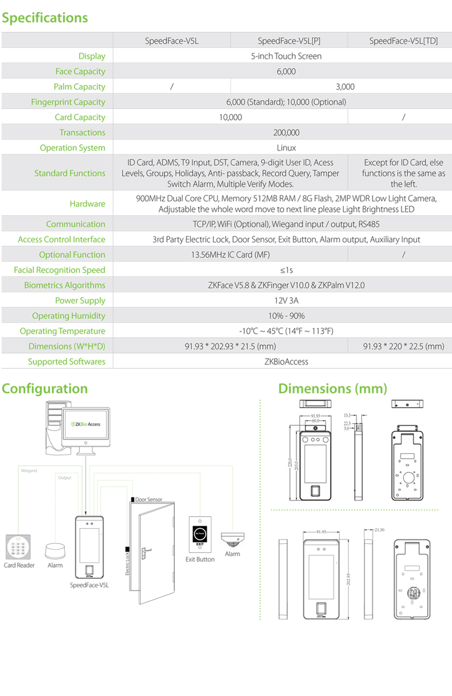 SpeedFace-V5L Series consists of highly advanced facial recognition terminals incorporated with smart facial recognition algorithms and the latest computer vision technology for unmatched performance with a massive storage capacity. The series supports accurate and rapid verification of both face and palm templates. The series is enhanced with touchless recognition technology and comes with inbuilt features fever detection (Temperature Measurement)and masked-facial identification for safe and hygienic user-verification.